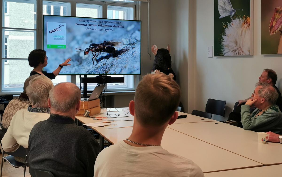 Toukokuun hyönteisillassa kuultiin tutkijatohtori Ina Satokankaan esitys kekomuurahaisten evoluutiosta ja risteytymisestä. Satokangas työskentelee Helsingin yliopiston Integrative Evolutionary Biology -tutkimusryhmässä.